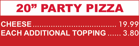 20″ Party Pizza OUR MENU Menu ≡ ╳ Pizza 20″ Party Pizza Gourmet Pizza Buffalo Wings Calzones Salads Appetizers Footlong 12″ Oven Baked Grinders Hot or Cold Dinners Soft Drinks Shop Cart Checkout My account