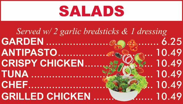 Salads OUR MENU Menu ≡ ╳ Pizza 20″ Party Pizza Gourmet Pizza Buffalo Wings Calzones Salads Appetizers Footlong 12″ Oven Baked Grinders Hot or Cold Dinners Soft Drinks Shop Cart Checkout My account [/html]